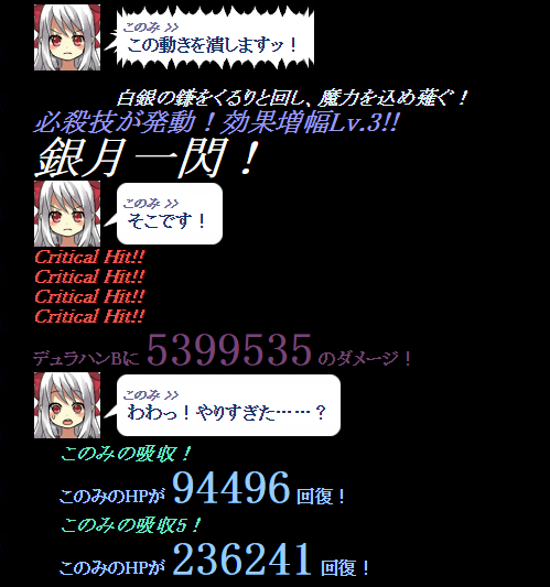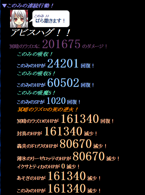 最初の連続攻撃は喰らうことになりますが、このみさん、食べた料理に硬化5が二連装され、装備にも一個ついてたためか異様な硬さを誇る。メンバーの中で一番ダメージをくらってなかったりする。やっばい、ちょっと本気だしすぎた?