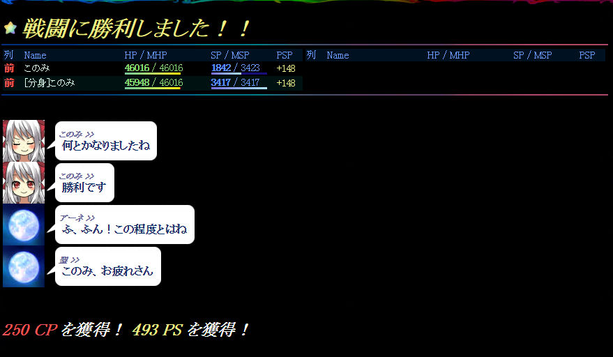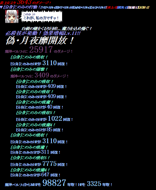 分身は本人のステータス、技設定などをそのまま生み出した後、HP、SP、PSPに変化が発生します。半分になるわけですね。