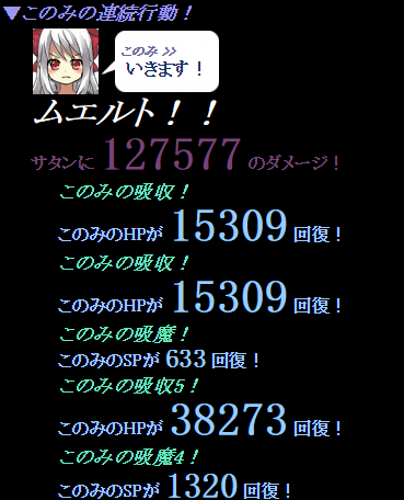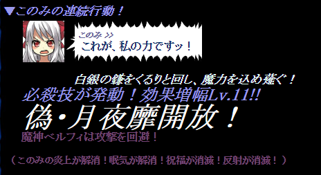 今回の戦闘でこのみは下から三枠目に鏡面世界を入れ、その下に11行動時必殺技、一番下にSP回転でムエルトを入れていました。