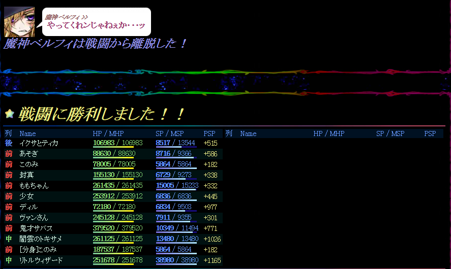 都合よくベルフィ戦にいけるッ!もう呼び出しもないみたいだし、ルリアンナさんは強かったけどなんか夢落ちみたいな感じだったしこれが僕らの最終決戦だーッ!ということに。
